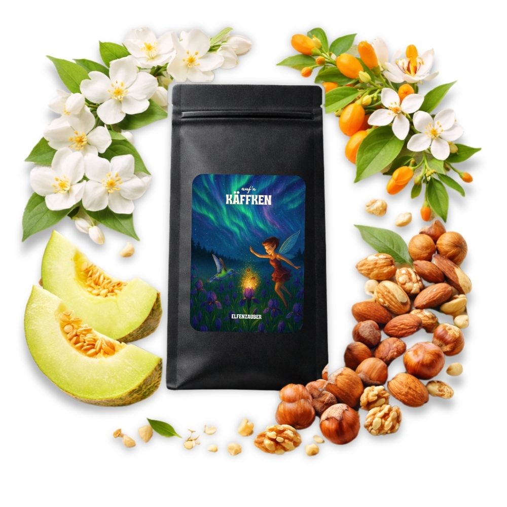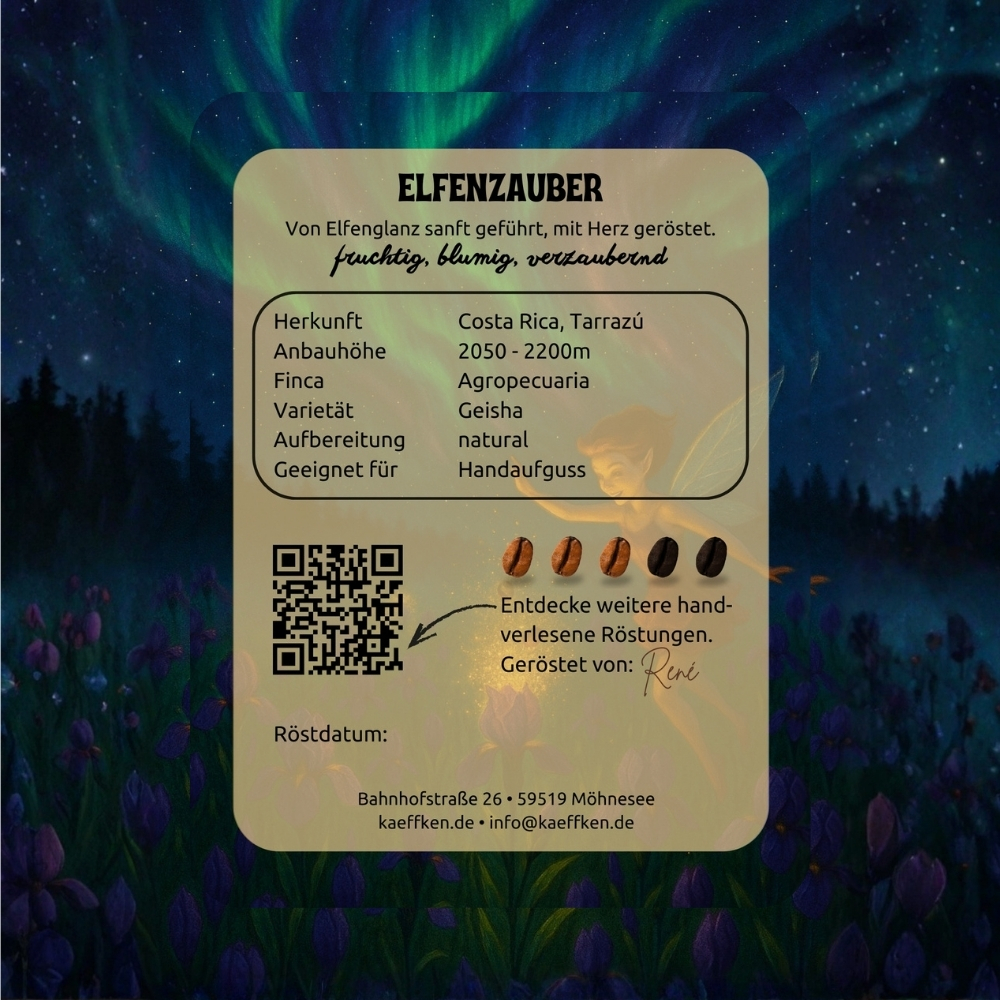 Von Elfenglanz sanft geführt, mit Herz geröstet: ein außergewöhnlicher Geisha Kaffeeaus Costa Rica mit floralen Noten von Jasmin- und Mandarinenblüte, begleitet von Honigmelone und feiner Nuss. Ein eleganter, komplexer Kaffee für besondere Genussmomente im Handaufguss.